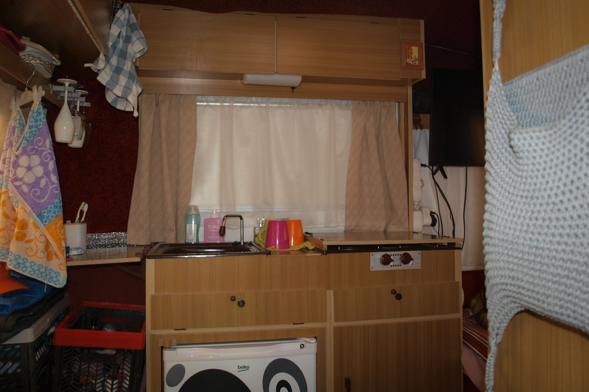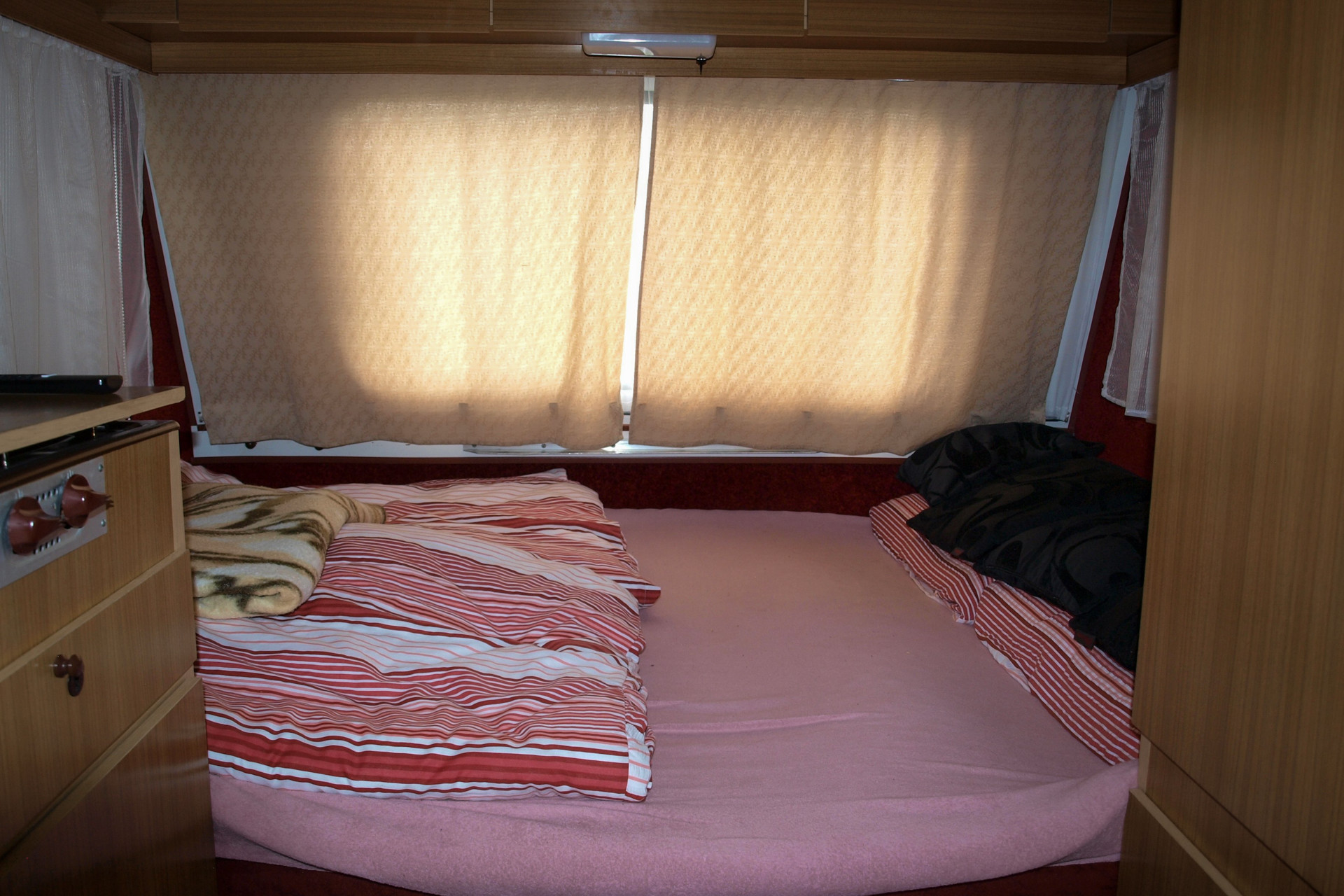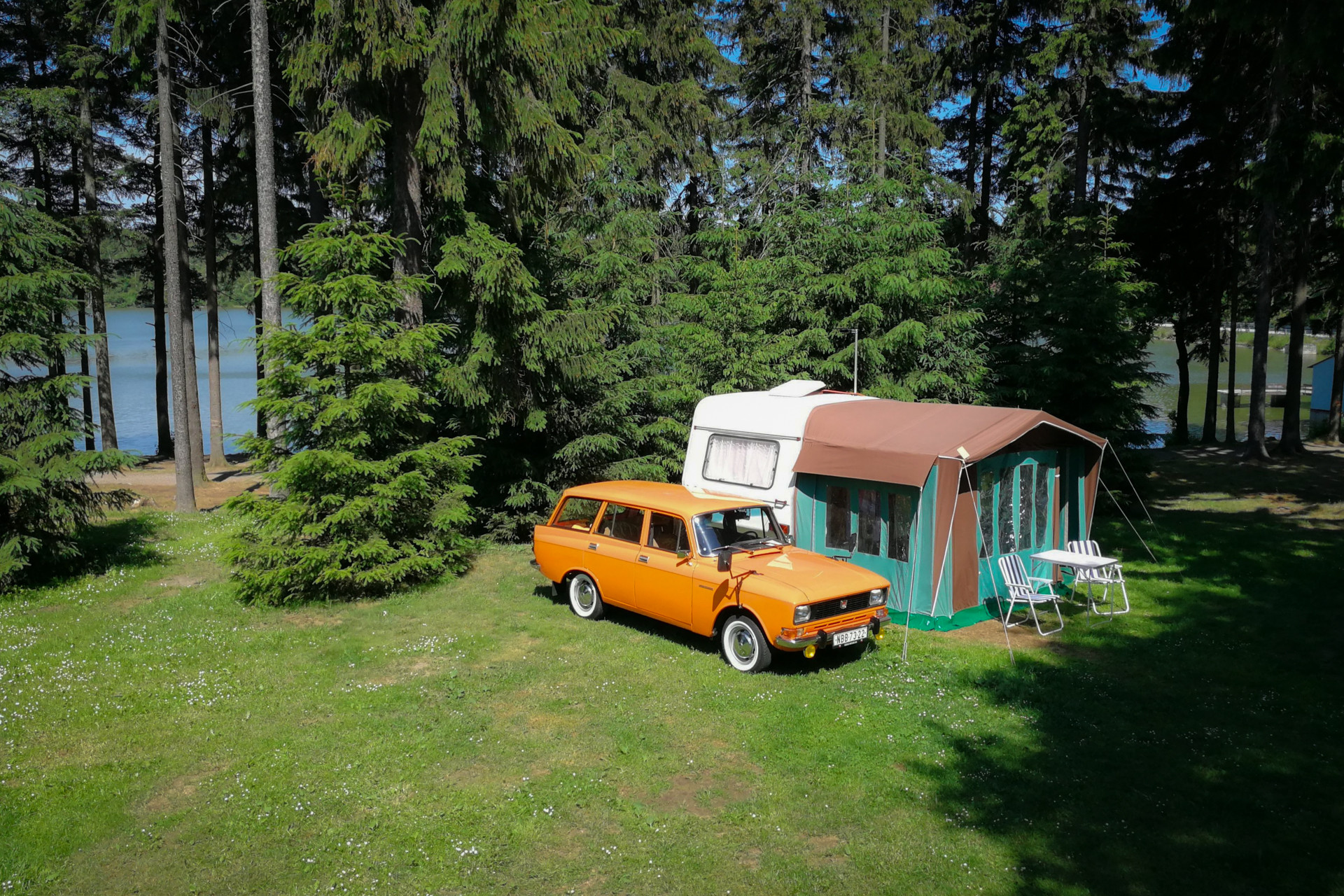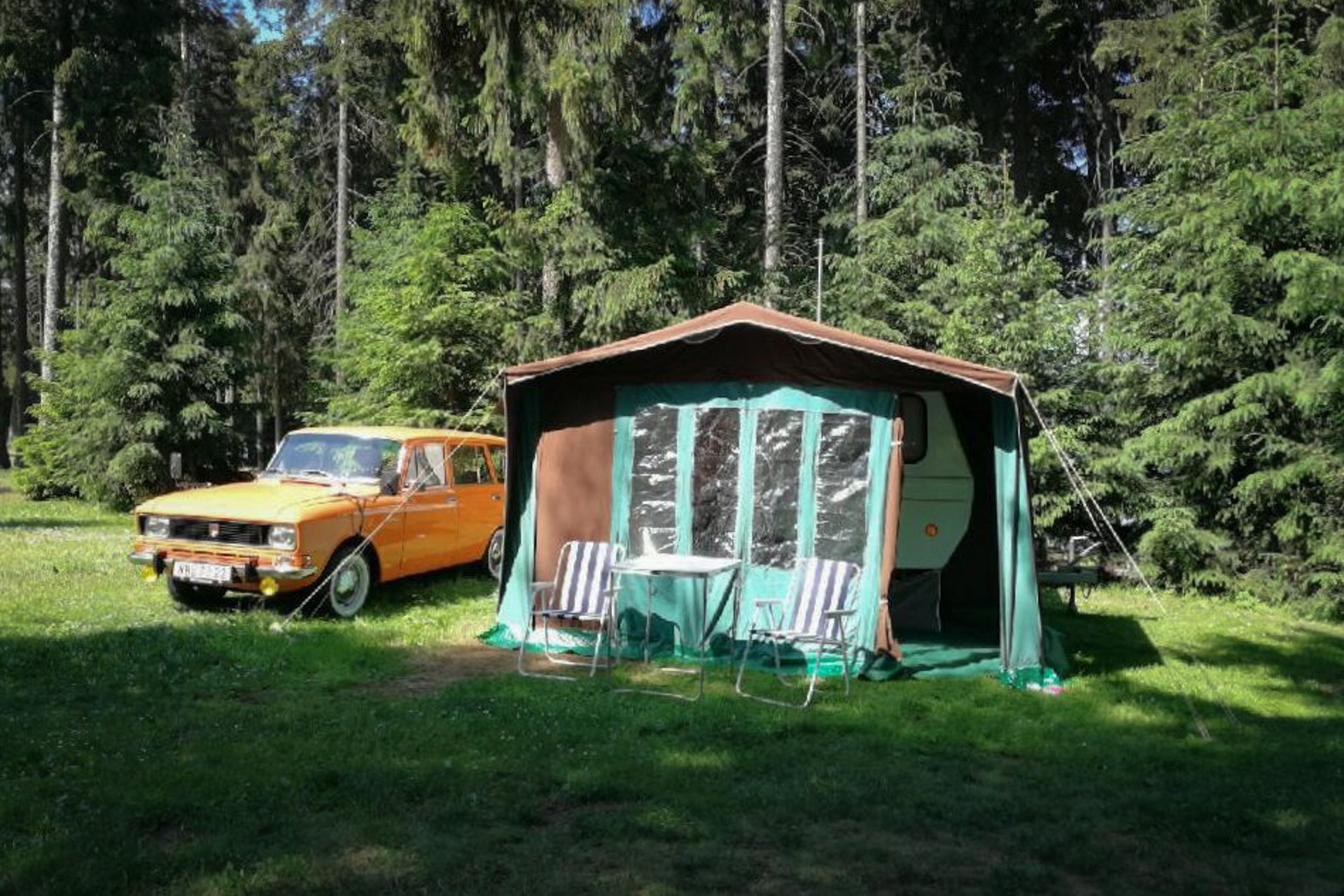 Obytný přívěs za osobní vozy.
