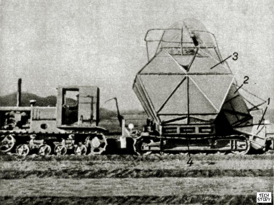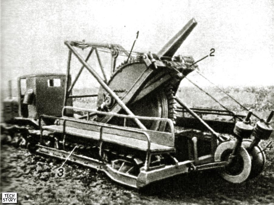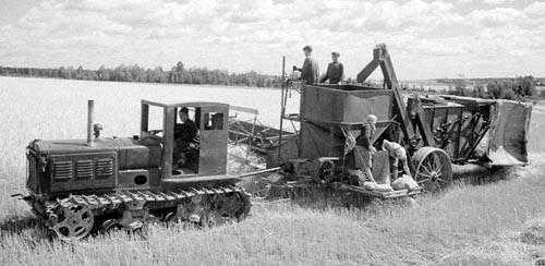 Předválečný pásový traktor. Jeden z nejjednodušších pásových traktorů, benzínový motor schopný spalovat kerosin, jednoduché opravy.