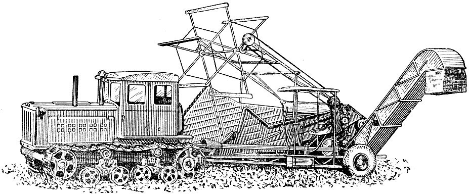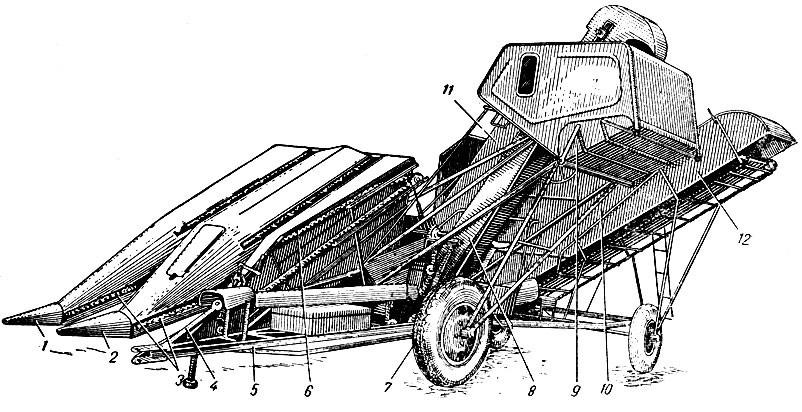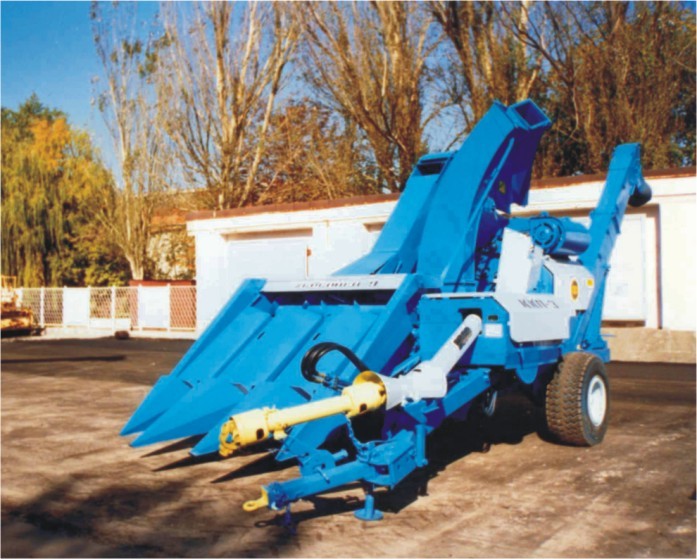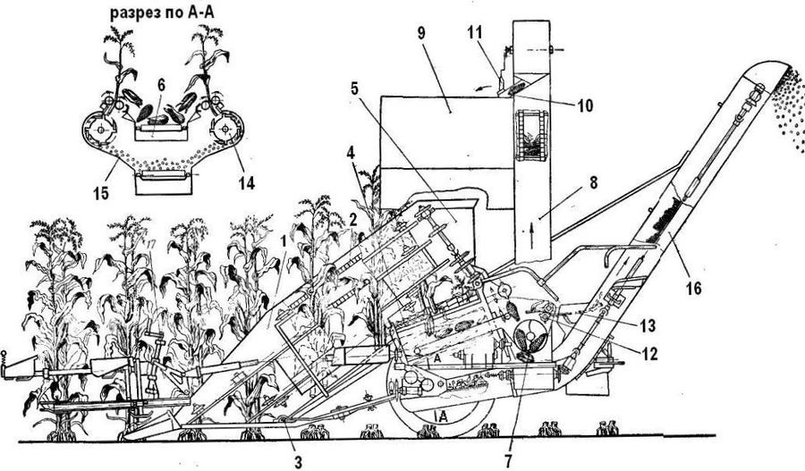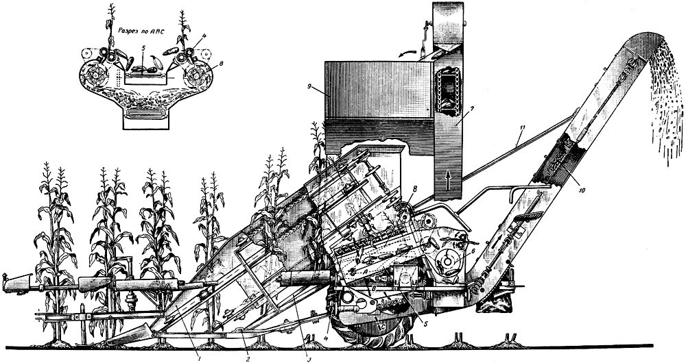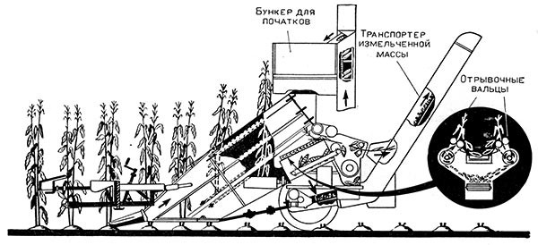 Kukuřičný kombajn určený ke sklizni kukuřice pěstované na zrno. Kombajn je závěsný a je tažen traktorem KD-35. Celou soupravu obsluhují tři pracovníci - traktorista, kombajnér, obsluhovač zásobníku. Silážní plodiny lze také sklízet upravenými obilnými kombajny Komunard, Stalinec-4 a Stalinec-6. Tohoto speciálního stroje používají v SSSR ke sklizni kukuřice pěstované na zrno. Kombajn kosí rostliny, odděluje od nich palice, které částečně čistí od blan, a rozřezává listy a stvoly na silážní hmotu. Kombajn je závěsný, pravořezný a je tažen traktorem KD-35. Strojem lze sklízet současně dva řádky kukuřice s meziřádkovou vzdáleností 70 nebo 90 cm. Palice se shromažďují v zásobníku na levé straně stroje a rozřezaná hmota v přívěsném zásobníku. Palice se ze zásobníku vyprazdňují samospádem a silážní hmota řetězovým lištovým dopravníkem. Kombajn má vpředu děliče, které tvoří dva žlaby. V obou stěnách žlabů jsou dva páry dopravních řetězů s výčnělky. Tyto řetězy dopravují odříznuté rostliny k odtrhávacím válcům, kde se oddělují palice. Oddělené palice padají na pásový dopravník. Který je dopraví ke šneku. Šnek je přenese na dopravník, jenž dopraví palice do zásobníku. Pod každým párem odtrhávacích válců je řezačka, která se skládá z nožového bubnu a z protiostří. Rozřezaná hmota se dopravuje dopravníkem do zásobníku. Pod dopravníkem je síto k zachycování kukuřičných zrn spadlých do silážního materiálu. Mechanismy se pohánějí od náhonového hřídele přes rychlostní skříň. Zásobník kombajnu je určen ke shromažďování silážního materiálu v době mezi vykládáním. Agregát (traktor, kombajn, zásobník) obsluhují tři pracovníci: traktorista, kombajnér a obsluhovač zásobníku. Hodinový výkon kombajnu při sklizni kukuřice s meziřádkovou vzdáleností 70 cm je 0,7 ha a s 90 cm meziřádkovou vzdáleností 0,85 ha. Řezanka je 40 mm dlouhá a strniště 9-10 cm vysoké. Obsah zásobníku na palice je 1 m 3 a zásobníku na silážní materiál 5 m3. Silážní plodiny lze také sklízet upravenými obilnými kombajny. V SSSR používají ke sklizni silážních plodin upravených kombajnů Komunard, Stalinec-4 a Stalinec-6. Tyto kombajny lze ke sklizni silážních plodin snadno přizpůsobit.