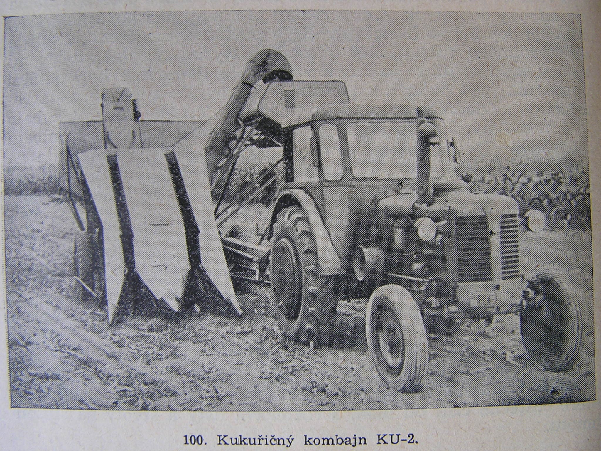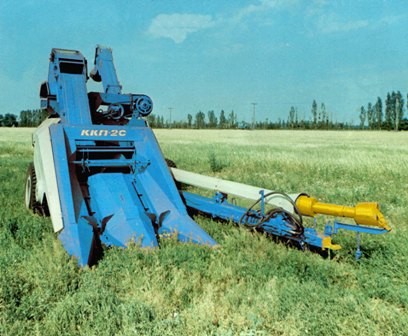 Kukuřičný kombajn určený ke sklizni kukuřice pěstované na zrno. Kombajn je závěsný a je tažen traktorem KD-35.