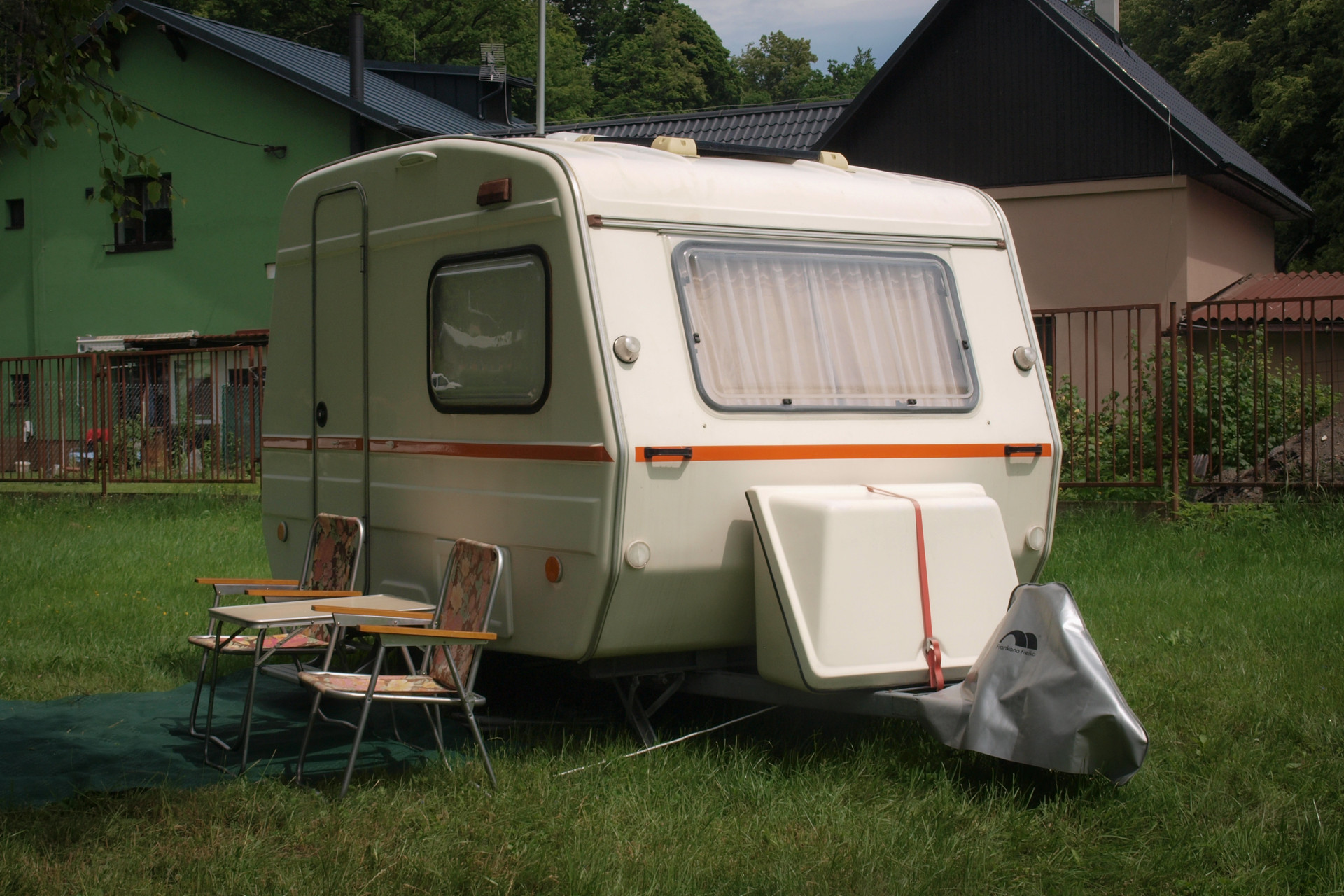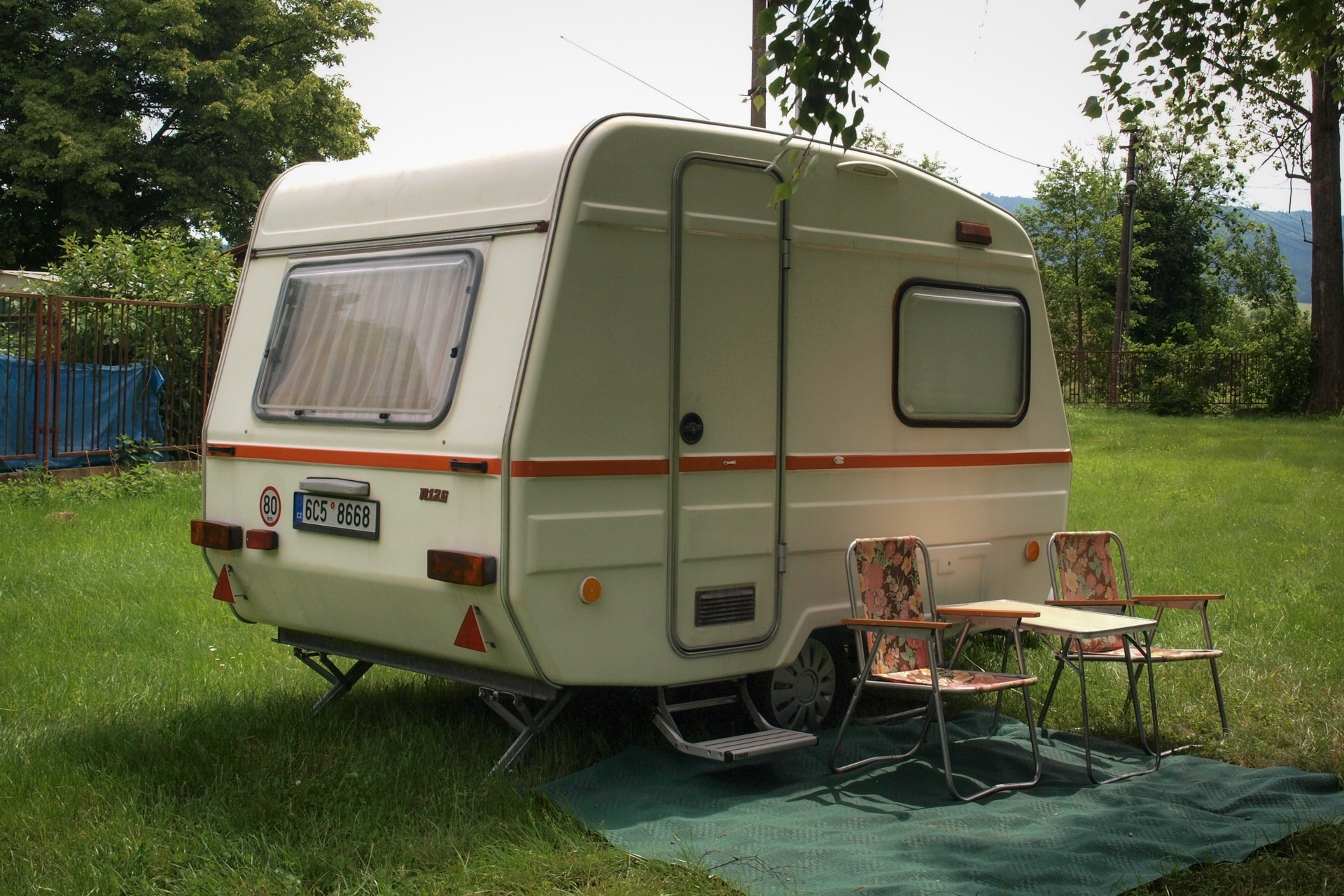 Obytný přívěs za osobní vozy.
